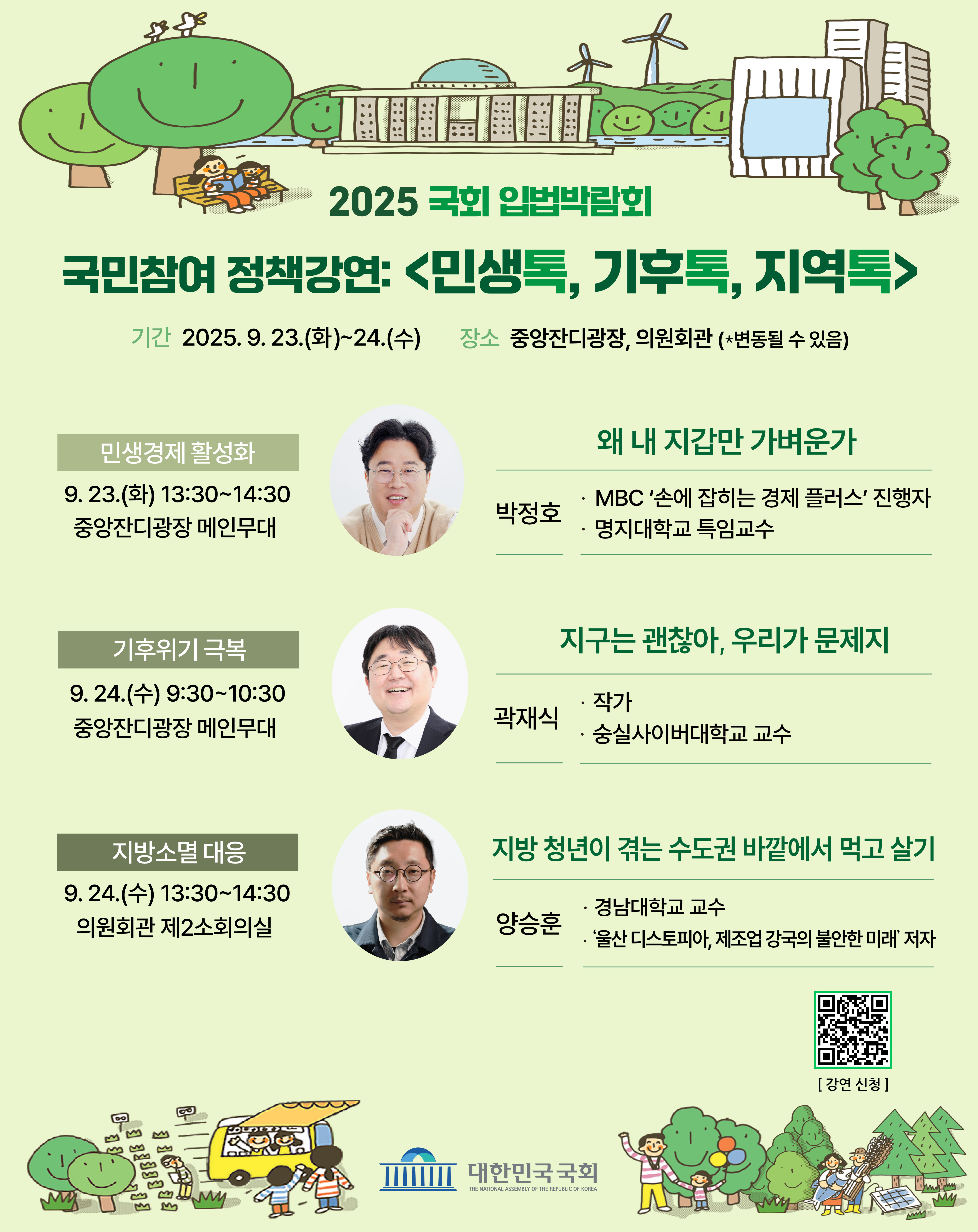 2025 국회 입법박람회에서 우리 사회의 3대 과제인 민생경제 활성화,기후위기 극복, 지방소멸 대응을 주제로 각 분야 전문가가 모여 어렵게 느껴지는 정책 이야기를 쉽게 여러분께 전합니다.